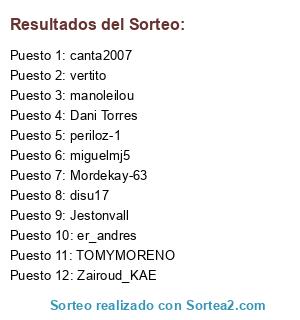 Lista de participantes: TOMYMORENO, Jestonvall, miguelmj5, Zairoud_KAE, Dani Torres, vertito, periloz-1, Mordekay-63, canta2007, disu17, er_andres, manoleilou.