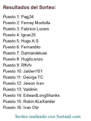 Lista de participantes: Pagj34, Valdinin, Hugito,enzo, Hugo A.S, Rffvfv, Jaiderr101, Ferney Montolla, EdwardLongShanks, Fernandito, Ivan Obr, Robin ALeXander, Fabricio Lucero, Jeison Ivan, George TC, Damiandeluxe, Ignac25.