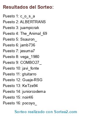 Lista de participantes: Ssauron_, juampicrak, vega_1980, KeTze94, gtuitarro, jamb736, javi_fonte, jesuma7, Guaje-RSG, ALBERTRANS, noir46, The_Animal_69, juniorcodema, pocoyo_, COMBO27_, c_o_s_a.