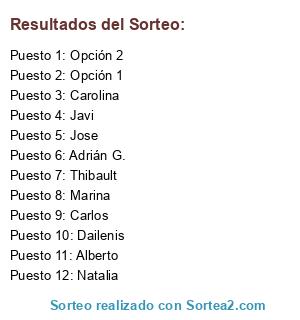 Lista de participantes: Adrián, Alberto, Bryan, Carolina, Irene, Javier, Jorge, Jose, JC, Juanjo, Lorena, Marcos, Sandra, Thibault, Opción 1, Opción 2.