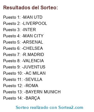 Lista de participantes: -BARÇA, -R.MADRID, -VALENCIA, -SEVILLA, -INTER, -JUVENTUS, -AC MILAN, -ROMA, -ARSENAL, -MAN CITY, -MAN UTD, -LIVERPOOL, -CHELSEA, -BAYERN MUNICH.