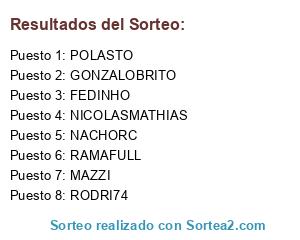 Lista de participantes: MAZZI, NICOLASMATHIAS, GONZALOBRITO, FEDINHO, POLASTO, NACHORC, RAMAFULL, RODRI74.
