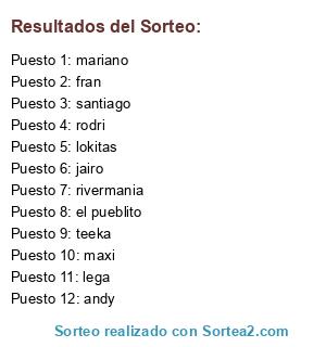 Lista de participantes: andy, lokitas, mariano, el pueblito, rodri, santiago, teeka, lega, fran, jairo, rivermania, maxi.