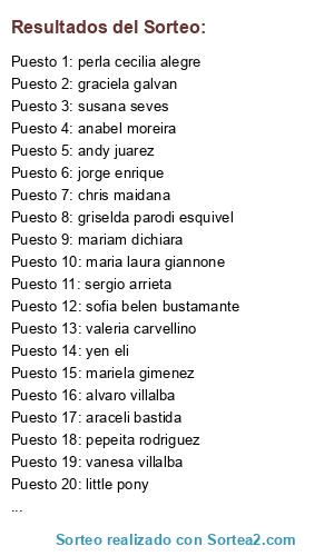 Lista de participantes: Verónica Staffolani, jorge enrique, little pony, gabriela orieta, ale nis, alvaro villalba, brenda casanello, graciela galvan, sergio arrieta, miriam hernandez, sofia belen bustamante, andrea yamada, griselda parodi esquivel, yen eli, la colo savone, anabel moreira, maria eugenia vallet vecchini, araceli bastida, pepeita rodriguez, susana rodriguez, maria laura giannone, perla cecilia alegre, susana seves, valeria carvellino, fer nanda, lili central bustos, mariam dichiara, mariela gimenez, vanesa villalba, gabriela naldini, mari gomez roullon, diana previti, andy juarez, chris maidana, melina agostini pelozzi, romy heredia, juli martinez.
