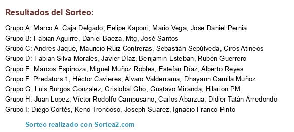 Lista de participantes: Juan Lopez, Héctor Cavieres, Predators 1, Luis Burgos Gonzalez, Estefan Díaz, Ciros Atineos, José Santos, Benjamin Esteban, Javier Díaz, Miguel Muñoz Robles, Alvaro Valderrama, Hilarion PM, Sebastián Sepúlveda, Diego Cortés, Andres Jaque, Víctor Rodolfo Campusano, Jose Daniel Pernia, Keno Troncoso, Fabian Silva Morales, Dhayann Camila Muñoz, Didier Tatán Arredondo, Marco A. Caja Delgado, Rubén Guerrero, Ignacio Franco Pinto, Gustavo Miranda, Carlos Abarzua, Mtg, Mario Vega, Felipe Kaponi, Mauricio Ruiz Contreras, Daniel Baeza, Alberto Reyes, Marcos Espinoza, Joseph Suarez, Cristobal Gho, Fabian Aguirre.
