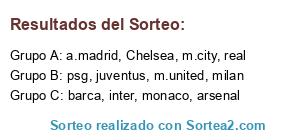 Lista de participantes: real, juventus, barca, milan, inter, psg, Chelsea, m.city, monaco, m.united, arsenal, a.madrid.