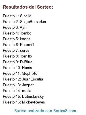 Lista de participantes: KaermiT, JuanEscutia, Isteria, Jazper, Bubuslavsky, DJBlue, Sibelle, Tornillo, seres, maila, SaigoBerserker, Mephixto, Tombo, Hanis, MickeyReyes, Ayrim.