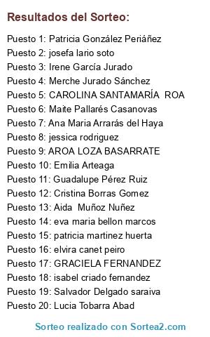 Lista de participantes: Irene García Jurado, Gisy Merino, GRACIELA FERNANDEZ, BERTA ABUJAS MOLINA, virginia ortiz segura, Lidia Martinez Merlán, eva maria bellon marcos, Ana Maria Arrarás del Haya, Eva Rodríguez Pinto, Marta Gonzalez Alcaide, Merche Jurado Sánchez, Carmen Melgar Jaquotot, Salvador Delgado saraiva, patricia martinez huerta, Lucia Tobarra Abad, isabel criado fernandez, Guadalupe Pérez Ruiz, Aida Muñoz Nuñez, Albert Comaposada Florensa, elvira canet peiro, delia ibañez jimenez, CAROLINA SANTAMARÍA ROA, jessica rodriguez, AROA LOZA BASARRATE, Maite Pallarés Casanovas, Emilia Arteaga, Patricia González Periáñez, VERONICA SANCHEZ MARCOS, Cristina Borras Gomez, josefa lario soto.