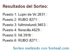 Lista de participantes: Yagle.1475 (6), Infrrod.4763 (6), Lupin de Vir.2831 (6), RaiDeN.5832 (6), espartaco.9587 (6), zaswer.5246 (1), Capi.3617 (1), fullmindundi.9453 (6), Ramses.5829 (1), Harpalice.5167 (2), Yenazka.2164 (6), Lele.5984 (6), Trompetissimo.2609 (6), crauling.6892 (2), Armeny.2143 (2), Blanxi.8560 (6), GranYog.9624 (1), RReena.3169 (2), Kenas.6749 (2), RUBO.8271 (2), Zorbius.2706 (6), fuly.2465 (2), Nil.3918 (6), Nemorks.2356 (2), Ryunthar.1450 (6), Mojuku.7658 (1), santiagovera.6719 (3), nanadesu.6902 (6), aboi.8967 (6), APGraid.4756 (2), florecilla.4629 (6), Hola.8725 (6), Andreylpz.1970 (1), Shubborath.2743 (1), Otrix.4716 (1).