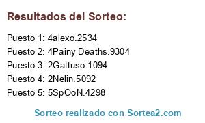Lista de participantes: 1Sylverin.7394, 2Sylverin.7394, 3Sylverin.7394, 4Sylverin.7394, 5Sylverin.7394, 1Sky Shader.7128, 1Aksho.2814, 2Aksho.2814, 1Kiryl.5189, 2Kiryl.5189, 3Kiryl.5189, 4Kiryl.5189, 5Kiryl.5189, 1Capgirell.2950, 2Capgirell.2950, 3Capgirell.2950, 4Capgirell.2950, 5Capgirell.2950, 1SpOoN.4298, 2SpOoN.4298, 3SpOoN.4298, 4SpOoN.4298, 5SpOoN.4298, 1alexo.2534, 2alexo.2534, 3alexo.2534, 4alexo.2534, 5alexo.2534, 1Drusylla.1350, 2Drusylla.1350, 3Drusylla.1350, 4Drusylla.1350, 5Drusylla.1350, 1Serra.5479, 2Serra.5479, 3Serra.5479, 4Serra.5479, 5Serra.5479, 1Follipe.2036, 2Follipe.2036, 3Follipe.2036, 4Follipe.2036, 1Jhen.5621, 1Painy Deaths.9304, 2Painy Deaths.9304, 3Painy Deaths.9304, 4Painy Deaths.9304, 5Painy Deaths.9304, 1Blanxi.8560, 1Espartaco.9587, 2Espartaco.9587, 3Espartaco.9587, 4Espartaco.9587, 5Espartaco.9587, 1Gattuso.1094, 2Gattuso.1094, 3Gattuso.1094, 4Gattuso.1094, 5Gattuso.1094, 1Yenazka.2164, 2Yenazka.2164, 3Yenazka.2164, 4Yenazka.2164, 5Yenazka.2164, 1Wetul.7041, 2Wetul.7041, 3Wetul.7041, 4Wetul.7041, 1Zirch.4970, 2Zirch.4970, 1Canabico Nocturno.6087, 2Canabico Nocturno.6087, 1Severus Garfazz.3047, 1Beltza.4637, 2Beltza.4637, 1Juju Miau.6140, 2Juju Miau.6140, 1Zetryrus.8394, 2Zetryrus.8394, 3Zetryrus.8394, 4Zetryrus.8394, 5Zetryrus.8394, 1Ryunthar.1450, 2Ryunthar.1450, 3Ryunthar.1450, 4Ryunthar.1450, 5Ryunthar.1450, 1Crauling.6892, 1Nelin.5092, 2Nelin.5092, 3Nelin.5092, 4Nelin.5092, 5Nelin.5092, 1Takabron.7902, 1JanWilder.2035, 1Winddance.5649, 1RaiDeN.5832.