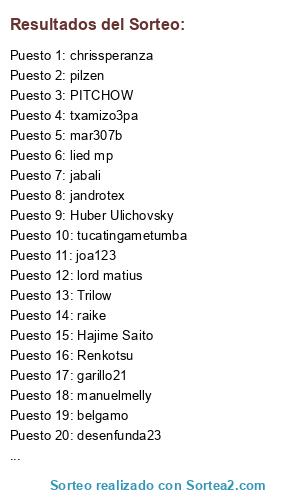 Lista de participantes: Diente de Marmota, tucatingametumba, kadorna, Renkotsu, jessanp, jabali, evel1, Apokalipto, kevinAPTK, Zir alfabica, manuelmelly, pityy18, josemelly5, ferny23, spasik, mar307b, pufoe, cincoestrellas, lord matius, Mexicanitó, Huber Ulichovsky, Huber Anibal, Aixeno, pilzen, F4usTo, elrapidonicolas, Busni, ezkaba pequeño, 11.11.11., garillo21, ismael04, jandrotex, undertaker88, pc47, todotuyo, joa123, desenfunda23, yosalve, Samoha, Quantas, shamain, luena, Nolwe, Armageddon, nemesisxxx, Xamberoux, belgamo, Jimmy Scarface, Bala asesina, RussianRulet, bassgs2, emiliohc, PITCHOW, Jhonny boy, theevilford2, Novac, Gargament, aquac, Joseph Duarte, raike, melford, -Damm-, facun, txamizo3pa, chrissperanza, CARAMELIN, lied mp, Trilow, poppins, usuario967, Hajime Saito, Jhon Canpero.