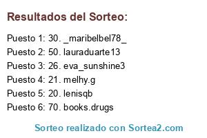 Lista de participantes: 1. nereamm89, 2. layeta_92, 3. ladycuqui, 4. entremundosymundanos, 5. lidiaesp17, 6. amorporloslibros7, 7. leywellbooks, 8. lachicaqueleia, 9. cuandoloslibroshablen, 10. dipitybluee, 11. lectoraapasasionada, 12. ritalahey13, 13. aalmuu, 14. bibianainbookland, 15. crislaguia, 16. marinacuesta43, 17. daismora, 18. caixon_dos_recordos, 19. claraonfire, 20. lenisqb, 21. melhy.g, 22. chicka_lit, 23. estefania_a_c, 24. lecturasfransy, 25. viveexperiencias, 26. eva_sunshine3, 27. lamia1872, 28. xiuminnie93, 29. mividaatravesdeloslibros, 30. _maribelbel78_, 31. estefi_fa, 32. betweenusblogg, 33. elenagzgz, 34. bookon_worldoff, 35. estanteriadecho, 36. mi_vida_por_un_libro, 37. reading_without_stopping, 38. marta_ryuichi, 39. obssesivexletters, 40. johannarc87, 41. eva.malfoy, 42. gabrielablanco202, 43. _sharemybooks, 44. librosconsentido, 45. mayra_gs, 46. montsevid, 47. frasesserieslibrosypeliculas, 48. lectora_indomable, 49. soraya_dlg7, 50. lauraduarte13, 51. _los_libros_de_lorena, 52. lectora_empedernida_romantica, 53. madelinpadilla, 54. faniabooks, 55. dreamingbooksblog, 56. reme_jr, 57. loverforbooks, 58. luciernagaliteraria, 59. raquelja24, 60. chicaelement_, 61. romr87, 62. vane17222, 63. elclubdelaslectoras, 64. katt_books, 65. lidia_0122, 66. taniaentrelibros, 67. cristipb91, 68. c.cayuela, 69. diego_jimenez96, 70. books.drugs, 71. mariamonber, 72. freijoabel, 73. booksfreak_read.