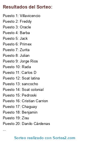 Lista de participantes: Chavez, Rada, Zoco, sancocho, Barba, Pepe, Manuel, Jack, Chaguay, Pedroski, Oracle, Carlos D, Jaime Orellana, Hilario Orellana, Freddy, Robertotototototo, Julian, Zurita, Villavicencio, Richard, Primex, Stephan, Tituaña, Zisu, Soat colonial, Soat latina, Cristian Carrion, Danilo Cárdenas, Jorge Rios, Benjamin.