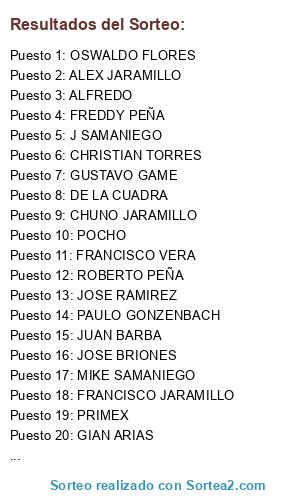 Lista de participantes: ALEX JARAMILLO, ALEX LEMUS, ALEXANDER ORDOÑEZ, ALFREDO, ANDRES ZAMBRANO, CHRISTIAN TORRES, CHUNO JARAMILLO, FRANCISCO JARAMILLO, FRANCISCO VERA, FREDDY PEÑA, GIAN ARIAS, GUSTAVO GAME, DE LA CUADRA, JOSE BRIONES, JOSE RAMIREZ, JUAN BARBA, MICHEL AYON, OSWALDO FLORES, PAULO GONZENBACH, POCHO, PRIMEX, ROBERTO PEÑA, MIKE SAMANIEGO, WINDERSON, J SAMANIEGO.