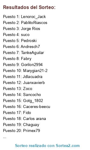 Lista de participantes: Zoco, Pedroski, Juanxavierb, Marygian21-2, Primex79, Caceres-beecu, Lenoroc_Jack, Gotg_1802, Gorilon2994, TankeAguilar, Jdlacuadra, PablitoRiascos, Andresch7, Fabry, Chaguay, Jorge Rios, Sancocho, suco, Carlos arana, Pepethecrow, Fido.