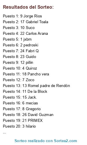 Lista de participantes: 1 jxbm, 2 pedroski, 3 hilario, 4 Quiroz, 5 Fenix, 6 mecias, 7 Zoco, 8 Gregorio, 9 Jorge Rios, 10 Suco, 11 De la Block, 12 pillin, 13 Romel padre de Rendón, 14 Pepe the sucre, 15 Jack., 16 Pablo Riascos, 17 Gabriel Toala, 18 Pancho vera, 19 Nacho, 20 Matatan, 21 PRIMEX, 22 Carlos Arana, 23 Guido, 24 Fabri Q, 25 bolivar parra, 26 David Guzman.