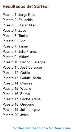 Lista de participantes: Quiroz, Jxbm, Chávez, Peter, Wacho, Hilario, Sancocho, Guido, Tanke, Miduvi, Fido, Zoco, Oscar Mier, Pedroski, Jack, Gregorio, Bernal, Jorge Rios, Nacho Gallegos, Carrión, Romel, DaniloC., Pablo Riascos, José de sucre, Ecuachin, Gabriel Toala, Primex, Jaime, Julian Lopez, Carlos Arana, Fabry Quijije, Carlos Caceres, Julio Franco, ORTIZ, Matatan.