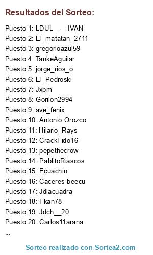 Lista de participantes: marygian21-2, pepethecrow, Gorilon2994, El_Pedroski, Jdlacuadra, Primex79, Jdch__20, el13lechero, Jcfrancomogro, Gotg_1802, jorge_rios_o, Fkan78, Lenoroc_Jack, Caceres-beecu, CrackFido16, PablitoRiascos, ggta3353, Carcas005, LDUL____IVAN, Antonio Orozco, Jxbm, Ecuachin, Suco, TankeAguilar, Hilario_Rays, El_matatan_2711, danilocoke90, ave_fenix, gregorioazul59, Carlos11arana, johng.