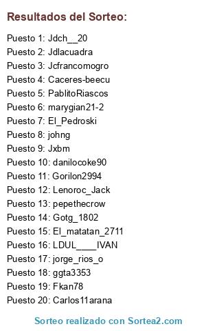 Lista de participantes: Caceres-beecu, Gorilon2994, ggta3353, Jxbm, El_matatan_2711, El_Pedroski, danilocoke90, marygian21-2, Jdch__20, Carlos11arana, Gotg_1802, Lenoroc_Jack, Fkan78, jorge_rios_o, LDUL____IVAN, Jcfrancomogro, johng, Jdlacuadra, pepethecrow, PablitoRiascos.