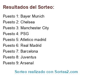 Lista de participantes: Chelsea, Barcelona, Juventus, PSG, Bayer Munich, Atletico madrid, Real Madrid, Manchester City, Arsenal.