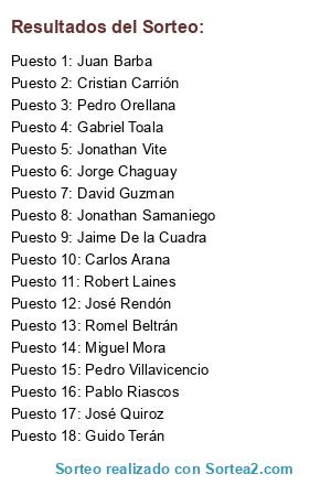 Lista de participantes: Carlos Arana, Cristian Carrión, David Guzman, Gabriel Toala, Guido Terán, Jaime De la Cuadra, Jonathan Samaniego, Jonathan Vite, Jorge Chaguay, José Quiroz, José Rendón, Juan Barba, Miguel Mora, Pablo Riascos, Pedro Orellana, Pedro Villavicencio, Robert Laines, Romel Beltrán.