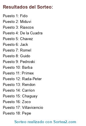 Lista de participantes: Barba, Romel, Carrion, Villavicencio, Rada-Peter, Jack, Pepe, Riascos, Zoco, Miduvi, Primex, Guido, Pedroski, Fido, Rendon, Chavez, Chaguay, De la Cuadra.