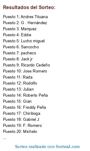 Lista de participantes: pacheco, Chiriboga, Rada, Jose Romero, Rodolfo, Marquez, Gabriel J, Andres Tituana, Brooks, Julian, Freddy Peña, Javier Hernández, Ricardo Cedeño, Lucho miguel, Pepe, Eddie, Michelo, G . Hernández, Hilario, F. Romero, Jaramillo, Jack jr, Roberto Peña, Gian, Sancocho, Parra, Benjamin.