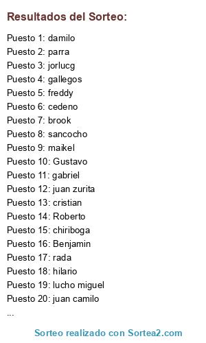 Lista de participantes: sancocho, Benjamin, brook, Gustavo, chiriboga, damilo, parra, juan camilo, edigar, freddy, gemelo, hilario, jorlucg, Roberto, gallegos, cedeno, primex, maikel, Tituana, cristian, gabriel, juan zurita, lucho miguel, rada.
