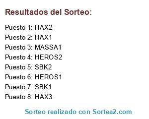 Lista de participantes: SBK1, SBK2, HAX1, HAX2, HAX3, HEROS1, HEROS2, MASSA1.