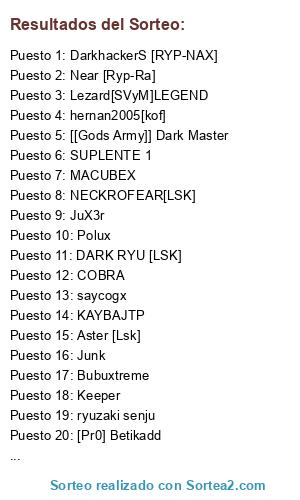 Lista de participantes: Aster [Lsk], Master Lou, DarkhackerS [RYP-NAX], Near [Ryp-Ra], chuitorayo, JuX3r, Junk, Crisler [Gods Army], MR. G, Kaos666 C.B.I, Dannyrck07 [LSK], K´Dash, RizThO18, Master Zero, Keeper, [Pr0] Betikadd, NECKROFEAR[LSK], [[Gods Army]] Dark Master, saycogx, DARK RYU [LSK], Lezard[SVyM]LEGEND, Bubuxtreme, hernan2005[kof], Mark127[SVyM], ryuzaki senju, CHEMA-DAK [W], MACUBEX, KAYBAJTP, COBRA, IORI2901[LSK], Polux, SUPLENTE 1.
