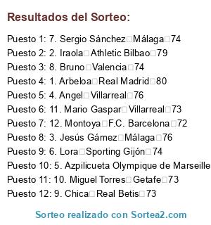 Lista de participantes: 1. Arbeloa Real Madrid 80, 2. Iraola Athletic Bilbao 79, 3. Jesús Gámez Málaga 76, 4. Angel Villarreal 76, 5. Azpilicueta Olympique de Marseille 75, 6. Lora Sporting Gijón 74, 7. Sergio Sánchez Málaga 74, 8. Bruno Valencia 74, 9. Chica Real Betis 73, 10. Miguel Torres Getafe 73, 11. Mario Gaspar Villarreal 73, 12. Montoya F.C. Barcelona 72.