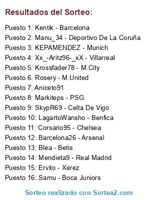 Lista de participantes: Mendieta9 - Real Madrid, Xx_-Aritz96-_xX - Villarreal, Blea - Betis, Rosery - M.United, Markiteps - PSG, SkypR69 - Celta De Vigo, Kentik - Barcelona, Ervito - Xerez, Krossfader78 - M.City, KEPAMENDEZ - Munich, Manu_34 - Deportivo De La Coruña, LagartoWansho - Benfica, Samu - Boca Juniors, Barcelona26 - Arsenal, Corsario95 - Chelsea, Aniceto91.