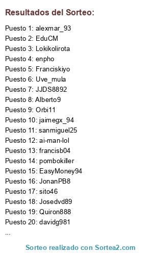 Lista de participantes: Aldipe, Adri_casti90, Josedvd89, ai-man-lol, enpho, Joryserso, pablo1093, Midaniel3, Danimese, Quiron888, Gons10, francisb04, fornides, apaez91, wazo, referee_21, pedroeloy95, danicozarch_25, mangel.sl, EduCM, Chemita1993, Orbi11, leticoes, JJDS8892, angei88, sito46, davidg981, alexmar_93, ellocuhd, JonanPB8, Uve_mula, sanmiguel25, Franciskiyo, EasyMoney94, Lokikolirota, pombokiller, jaimegx_94, Gradozero, Sánchez, Alberto9.