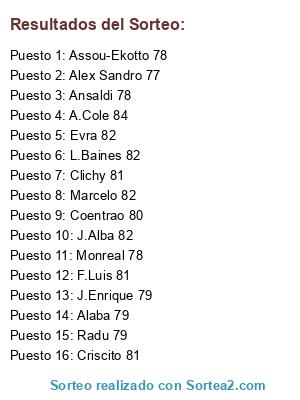 Lista de participantes: A.Cole 84, J.Alba 82, Marcelo 82, L.Baines 82, Evra 82, Clichy 81, F.Luis 81, Criscito 81, Coentrao 80, Alaba 79, J.Enrique 79, Radu 79, Monreal 78, Assou-Ekotto 78, Ansaldi 78, Alex Sandro 77.