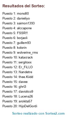 Lista de participantes: thee.Kiidd, kolorin, HijoDelGordi, Nandetre, wolverine_rms, FSSR!!, saimon1393, mono80, guillem93, sergitoxx, arokita57, katacrack, danieliyo, borjaoli, alccapone, daviolico9, davee, Er_FiLLO, ghrt3, Lucena26.
