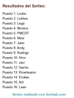 Lista de participantes: Andy, Arii, Endien, Jairo, Javi, Lean, Lega, Locke, Lukitas, Morens, Nacho, Nico, PMCDT, Maxi, Riverteamo, Rodrigo.