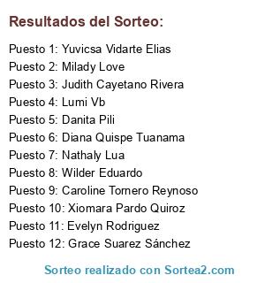 Lista de participantes: Danita Pili, Katherine MV, Rocio Ramírez, Mónica Paola Durey, Itala Bravo, Ingrid Diaz Ponce, Caroline Tornero Reynoso, Clau Alcalde, Ijmc Mi Vida, Yuvicsa Vidarte Elias, Alberto D Ascanio, Shirleysita Onofre, Yomira Fer, Rossamgela D Reyna, Jessica Rossi Gonzales, Rocio Milagros Mejia Rojas, Salvador Cruz Alfaro, Xiomara Pardo Quiroz, Pamelita Vega, Maylii Carrillo Roman, Grace Suarez Sánchez, Roxana Pamela Aquino Aquino, Teresa Paola PH, Romina Alexandra Murillo, Maritza Olivares, Milagros Echeniqe, Mary Reyes, Lumi Vb, Nathaly Lua, Yuliana Delgado Bazan, Judith Cayetano Rivera, Zumi Ramos, Isa Mejia, Je Si K, Nataly Ariana de la Cruz, Lorena Garcia Mujica, Eliana Isabel Quintana DIaz, Jannet Gisella Huisa de Chavez, Wilder Eduardo, Andre Vargas Infanson, Joselyn Aragon, Geraldine Pacifica, Lalita Calderon, Karlita Olivo Miranda, Leslita Nuñez, Rocio Mn, Gloria Luyando, Jenny Ureta Jacinto, Diana Yraola, Vidal Vidal, Diana Quispe Tuanama, Deysi Hilario Casqui, Catherine Chilenita, Yenny Marlene Sovero Hidalgo, Lidia Sanabria Zambrano, Milux Jara, Jenny Roxana, Karima Nano Ventosilla, Rosemary Romero, Milady Love, Edith Aponte Pomasoncco, Karin Lopez, Monica Caceres, Evelyn Rodriguez, Jeidy de la Cruz Rivera.