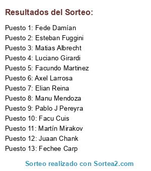 Lista de participantes: Gomez Matias, Juaan Chank, Fede Damían, Martín Mirakov, Facundo Martinez, Pablo J Pereyra, Esteban Fuggini, Matias Albrecht, Marcos Crelia, Axel Larrosa, Fechee Carp, Marcos Reichel, Ema Thiago Tabarez, Vasito de Agua, Agussz Giimenez, Joaco Vasquez, Luciano Guanatey, Facu Cuis, Elian Reina, Marcos Lesser, Enzo Moffeson, Milton Ezequiel Almiron, Nicolás Rey Castro, Maximo Perez, Facu Chamas, Nahu Tacconi, Lucas Aranda, Manu Mendoza, Nico Coria, Luciano Girardi, Julian Giaccio.