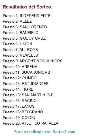 Lista de participantes: ALL BOYS, ARGENTINOS JUNIORS, ARSENAL, ATLETICO RAFAELA, BANFIELD, BELGRANO, BOCA JUNIORS, COLON, ESTUDIANTES, GODOY CRUZ, INDEPENDIENTE, LANUS, NEWELLS, OLIMPO, RACING, SAN LORENZO, SAN MARTIN (SJ), TIGRE, UNION, VELEZ.