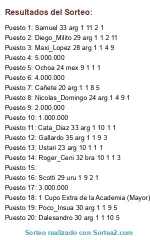 Lista de participantes: Dalesandro 30 arg 1 1 10 5, Ochoa 24 mex 9 1 1 1, Diego_Milito 29 arg 1 1 2 11, Ustari 23 arg 10 1 1 1, Roger_Ceni 32 bra 10 1 1 3, Cata_Diaz 33 arg 1 10 1 1, Cañete 20 arg 1 1 8 5, Samuel 33 arg 1 11 2 1, Poco_Insua 30 arg 1 1 9 5, Nicolas_Domingo 24 arg 1 4 9 1, Maxi_Lopez 28 arg 1 1 4 9, Scotti 29 uru 1 9 2 1, Gallardo 35 arg 1 1 9 3, 5.000.000, 4.000.000, 3.000.000, 2.000.000, 1.000.000, 1 Cupo Extra de la Academia (Mayor), .