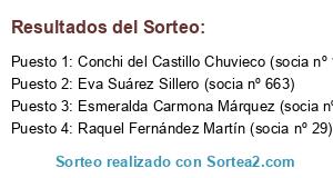 Lista de participantes: Marina González Rueda (socia nº 210), Carlota Sebastián Fernández-Velilla (socia nº 46), Verónica Millón Sánchez (socia nº 340), Eva Suárez Sillero (socia nº 663), María Luisa Crespín Ariza (socia nº 300), Eva Rodriguez Toril (socia nº 418), Esmeralda Carmona Márquez (socia nº 333), Paqui Fernández García (socia nº 11), Lydia Boiza Fernández (socia nº 523), Yessica Ruiz Villamarin (socia nº 270), Ana María Herrera González (socia nº 298), M.Carmen Gonzalez Alvarez (socia nº 429), Conchi Pérez Lago (socia nº 628), Mariela Quero Reina (socia nº 110), Cristina Trigo Clara (socia nº 94), Mª Isabel Guerrero Medina (socia nº 259), Manuel María Nieto Rodriguez (socio nº 27), Inés Quero Reina (socia nº 109), Raquel Fernández Martín (socia nº 29), Beatriz Dondarza Gonzalez (socia nº 79), Cristina Uriarte López (socia nº 194), Esther Chamizo Villar (socia nº 37), María Ángeles Morales Rivas (socia nº 524), Conchi del Castillo Chuvieco (socia nº 15), Maria Esperanza León Quintana (socia nº 347), Noelia Alemán Caravaca (socia nº 80), María José Toscano Moreno (socia nº 61), Ana María Navarro Flores (socia nº 306), David Jara Ruiz (socio nº 268).