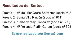 Lista de participantes: Blanca Carrillo Domínguez (socia nº 166), Remedios Alcaraz (socia nº 150), Salomé de Cesero Frijol (socia nº 620), Adriana Vilela Patiño (socia nº 230), Sonia Villa Rincón (socia nº 614), Mª del Mar Otero Serrantes (socia nº 276), Angeles Iglesias Castro (socia nº 91), Kimberly May González (socia nº 699), Mª Yolanda Peñin García (socia nº 308), Marta Pereira Rodríguez (socia nº 534).