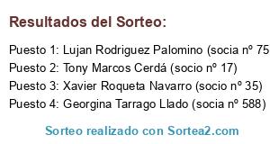 Lista de participantes: Xavier Roqueta Navarro (socio nº 35), Ana Lujan Rodriguez (socia nº 315), Tony Marcos Cerdá (socio nº 17), Nil Pellicer Carrillo (socio nº 536), Blanca Carrillo Domínguez (socia nº 166), Lujan Rodriguez Palomino (socia nº 75), Maria de los Ángeles Ruedas de la Fuente (socia nº 410), Rosa Maria Esplugas Cañas (socia nº 568), Georgina Tarrago Llado (socia nº 588), Rosa María Barrero Segon (socia nº 598).