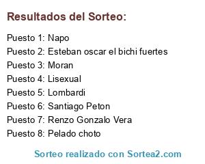 Lista de participantes: Esteban oscar el bichi fuertes, Napo, Renzo Gonzalo Vera, Moran, Santiago Peton, Lombardi, Pelado choto, Lisexual.
