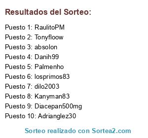 Lista de participantes: absolon, Adrianglez30, Danih99, Diacepan500mg, dilo2003, Kanyman83, losprimos83, Palmenho, RaulitoPM, Tonyfloow.