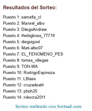 Lista de participantes: DiiegoAndrew , samafia_cl, pboh25, cruzadeath, tomas_villegas, LBlass, EL_FENOMENO_PES, Mati-albo07, thebigboss_77719, dieguigool, nikocra2011, TON-WA, RodrigoEspinoza , Manxel_albo.