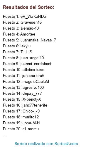 Lista de participantes: agresivo100, alemao-10, aLvarofresco, Amortee, arfeador, atletico-luiso, Aurich87, BlindCat91, Cases_89, Chico-_-9, cortex_xx, cuuuk, depay_777, el_mercu, ELAYUWOKI11, enrimabe07, er_hector, eR_WaKaNDu, EsTiBiNhO, Globetrotter__10, Gravesen16, isra_almansa, jahc77tenerife, jliy0, Jona-M-H, jonaportero6, Jorgelm7__CaeLuM, jorgermartos, jose-cartama, Jpadfor, juan_angel10, Juanmaka_Navas_7, juanmi_cordobacf, Labestianegra_10, lakylu, luismacho19, m1n3r0, magetoCaeluM, marlito12, maskyrojillo, mateocamisa10, oriolcito11, pedrogines79, penha69, Peperecre1987, rafabp79, raulinho_jugon, RubifumY, sisqogr, soccatala73, TiLiLiS, Treny1984, Vazquezbook82, Wantxope9, X-peridtj-X.
