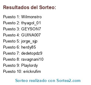 Lista de participantes: dedetopdz9, jorge_sjp, GUINA007, GEYSON7, herdy85, erickrufim, ravagnani10, Wilmonstro, thyagol_01, Playlordy.