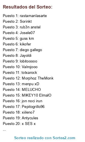 Lista de participantes: baricelli, WILLY18 T9R10, kikofer, Jayoldi, Naranjito82, Pereirinho, colon666, Principito85, poyove, Danivasp, lobitooooo, Murill069, SeRgyo2011, MELUCHO, SergioCollado, rastamanlasarte, poliny, raulmar, manolozon, guss km, Morphoz TheMonk, DAVILON69, TurfyTomas, Valrojooo, x SES x, exposito11, AdeptFormula9, Pepitogrillo96, izenbako123, Calvente Civic, slassi14, thecatonair, Ehos4, fitohipi, diego gallego, menpu xD, Namukai360, sanmaa, Josele07, aitorr92, deviantpurse60, xiileno7, Antycules, rub3n anstel, Sorinkt, jon noci irun, OverPick, Erchuliyo 24, FANDI 87, gabripf, totxarock, MIKEY10 ElmalO.