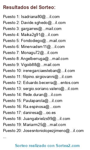 LOS 3 PRIMEROS SE LLEVAN EL PREMIO. LOS SUPLENTES SON LOS SIGUIENTES EN EL ORDEN ALEATORIO GENERADO POR EL SORTEO
